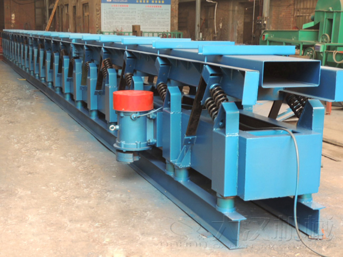 振動輸送機由由鐵芯、線圈、銜鐵和料槽等構成。整流后的電暢通過線圈時,發生周期變更的電磁吸力,激起料槽發生振動。電磁振動輸送機一般采取高頻率、小振幅。