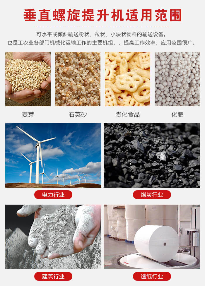 螺旋垂直提升機(jī)是用來(lái)水平或傾斜輸送粉狀、粒狀、小塊狀物料的一般用途的輸送設(shè)備, 螺旋輸送給料機(jī)是工農(nóng)業(yè)各部門(mén)機(jī)械化運(yùn)輸工作的主要機(jī)組,可使運(yùn)輸工作減輕勞動(dòng)強(qiáng)度,提高工作效率,應(yīng)用范圍很廣。