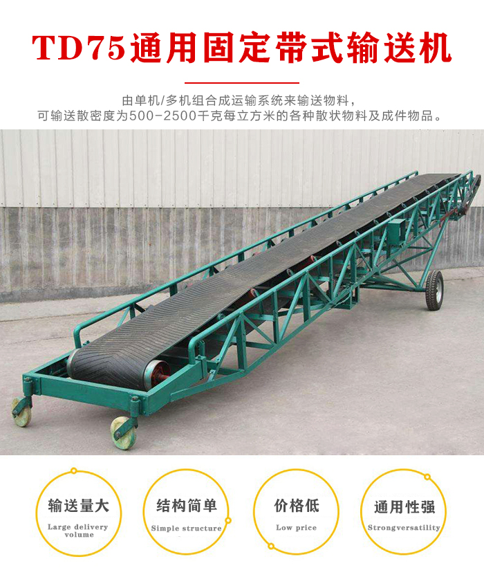 TD75通用固定帶式輸送機(jī)由于輸送量大、結(jié)構(gòu)簡(jiǎn)單、維護(hù)方便、成本低、通用性強(qiáng)等優(yōu)點(diǎn),而被廣泛地應(yīng)用在冶金、礦山、煤炭、港口、交通、水電、化工等部門進(jìn)行裝車、裝船、轉(zhuǎn)載或堆積各種常溫狀態(tài)的松散密度為500~2500kg/m3各種散狀物料或成件物品。