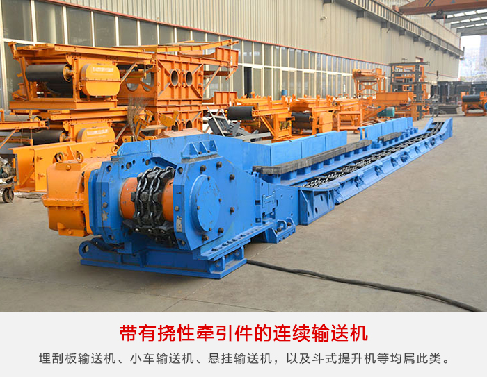 帶式輸送機(jī)、鏈板輸送機(jī)、刮板輸送機(jī)、埋刮板輸送機(jī)、小車輸送機(jī)、懸掛輸送機(jī),以及斗式提升機(jī)等均屬此類。其工作特點(diǎn)是把物品置于承載件上,由撓性牽引件搬運(yùn)承載件沿著固定的線路運(yùn)動(dòng),靠物品和承載件的摩擦力使物品與牽引件在工作區(qū)段上一起移動(dòng)。